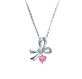 甜甜的,粉夢幻的心,墜款似蝴蝶結造型,隨著緞帶交織的結,鑲嵌1顆心型粉紅剛玉鑽石項鍊